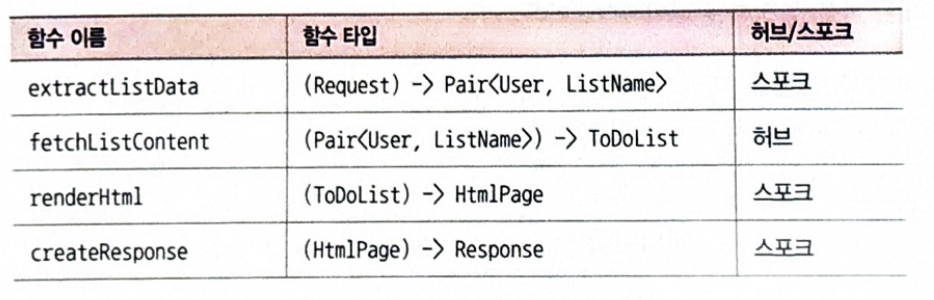 책에서는 기술적 요소와 비즈니스 요소를 스포크와 허브로 분리한다. 지금까지 만든 로직을 살펴보면 총 4가지 메서드이다. 함수 시그니처만 확인해도 어떤 함수가 허브이고 어떤 함수가 스포크인지 알 수 있다.