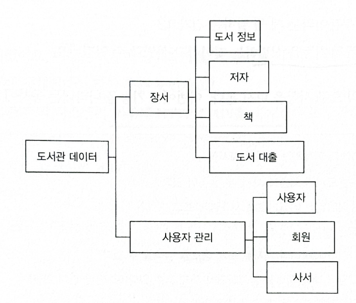데이터 개체는 시스템의 정보를 보관하는 부분이다. 도서관 시스템에서 필요한 데이터를 마인드맵으로 정리하면 이 정도로 나타낼 수 있다.