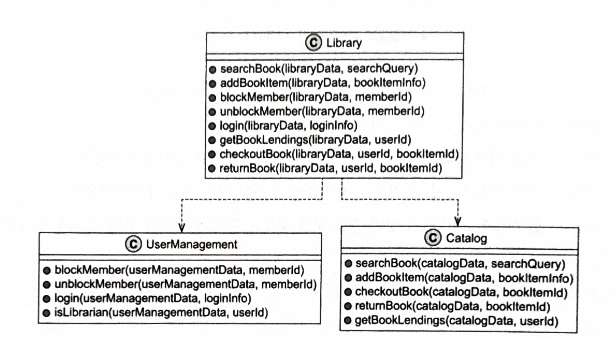 코드 모듈은 시스템의 기능이다. 책에서는 외부에 공개되어야 할 API들로 Library라는 상위 모듈을 구성하고 이전에 정의한 2가지 데이터 개체를 다룰 2가지 모듈을 추가했다. 코드 모듈에는 2가지 특징이 있는데 하나는 무상태 함수라는 점이고 또 하나는 사용 관계만 존재할 수 있다는 점이다. 명세에서도 볼 수 있겠지만 각 메서드에서 다룰 데이터는 인자로 받아서 사용하고 Library는 UserManagement와 Catalog를 사용하고 있다.