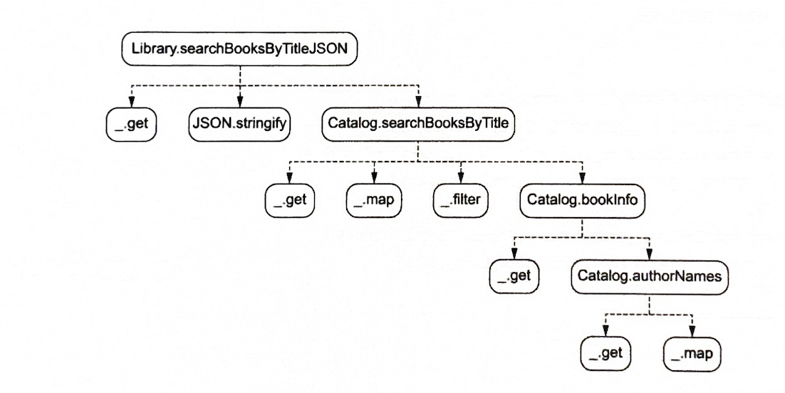 DOP에서 조회를 수행하는 메서드는 어떻게 테스트를 해야할까? Library.searchBooksByTitleJSON 메서드를 예시로 알아보자. 우선 테스트하려는 메서드에 의해 호출되는 함수들로 트리를 만든다. 꼭 트리를 만들지 않아도 머리 속으로 그려지면 된다. 트리의 가장 하단에 존재하는 메서드의 테스트가 가장 간단하다. 그 이유는 테스트할 부분이 메서드 메서드 자신밖에 없기 때문이다.
